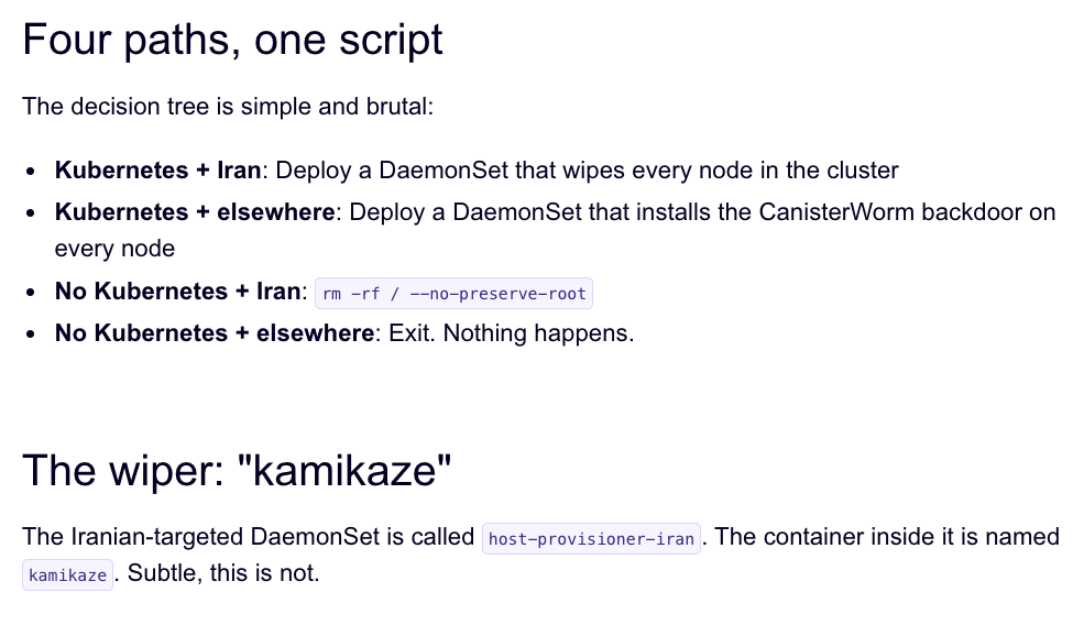 Over the weekend, the same technical infrastructure TeamPCP used in the Trivy attack was leveraged to deploy a new malicious payload which executes a wiper attack if the user’s timezone and locale are determined to correspond to Iran, said Charlie Eriksen, a security researcher at Aikido. In a blog post published on Sunday, Eriksen said if the wiper component detects that the victim is in Iran and has access to a Kubernetes cluster, it will destroy data on every node in that cluster.