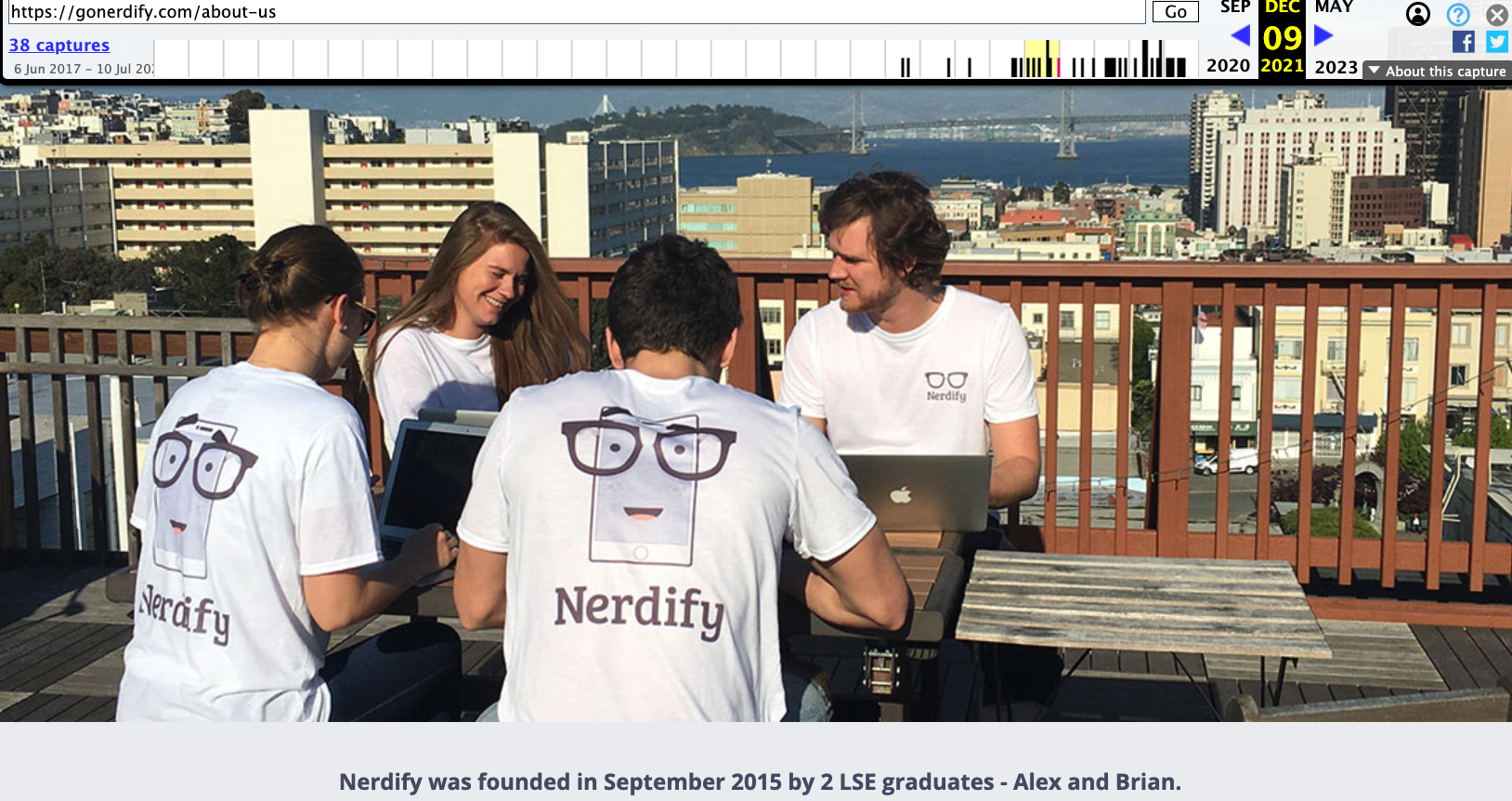 A closer look at an early “About Us” page for Nerdify in The Wayback Machine suggests that Mr. Perkon was the real co-founder of the company: The photo at the top of the page shows four people wearing Nerdify T-shirts seated around a table on a rooftop deck in San Francisco, and the man facing the camera is Perkon.