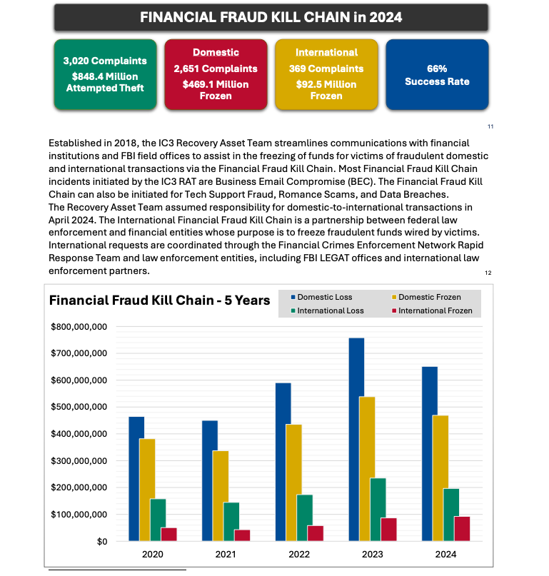 The FBI noted in its IC3 annual report (PDF) that the FFKC had a 66 percent success rate in 2024. Viable ic3.gov complaints involve losses of at least $50,000, and include all records from the victim or victim bank, as well as a completed FFKC form (provided by FinCEN) containing victim information, recipient information, bank names, account numbers, location, SWIFT, and any additional information.